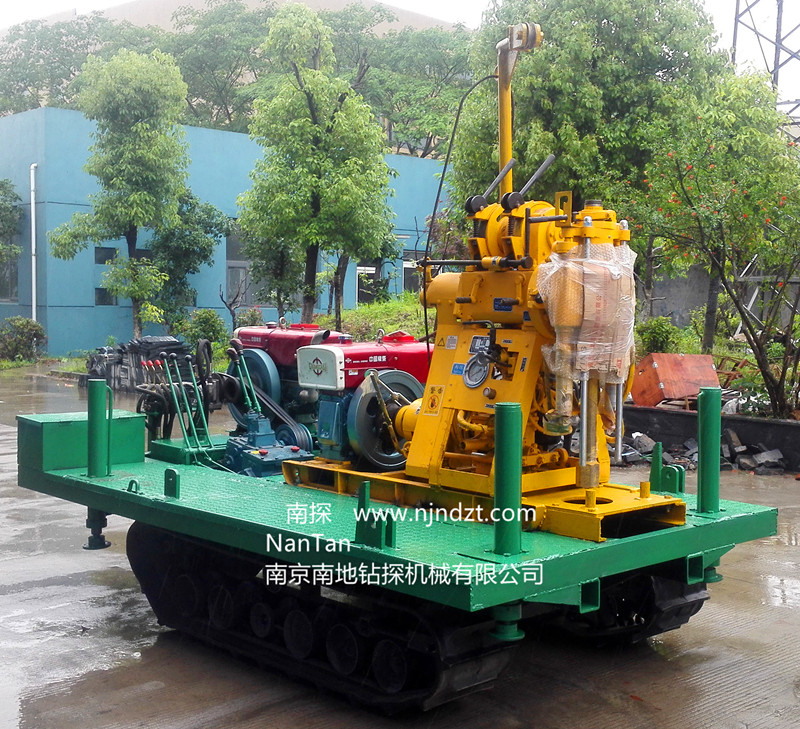 一、簡(jiǎn)介 XY-1-L-01-A(B)型履帶鉆機(jī)及人字形四角架鉆塔,是將橡膠履帶底盤、動(dòng)力(柴油機(jī)或電機(jī))、鉆機(jī)、A型為4組手動(dòng)支撐腿B型為4組液壓支撐腿、鉆機(jī)平臺(tái)、6米高人字形四角架起落鉆塔、水泵等共同組裝在一個(gè)機(jī)架上。鉆機(jī)、水泵一個(gè)動(dòng)力(柴油機(jī)或電機(jī)),橡膠履帶底盤一個(gè)動(dòng)力(柴油機(jī)或電機(jī))帶動(dòng),互不干擾。該機(jī)型具有爬坡能力強(qiáng)、鉆進(jìn)和行走穩(wěn)定可靠、載重質(zhì)量大等優(yōu)點(diǎn),適用于地質(zhì)、冶金、煤炭、水文、建筑工程、水電工程、公路、鐵路、港口城建、橋梁、壩基等建筑物的工程地質(zhì)勘察、淺層探礦、礦山坑道、水井、小型灌漿孔、爆破孔的鉆進(jìn)。該鉆機(jī)是適應(yīng)新型市場(chǎng)需求不可多得的理想設(shè)備之一。可在海灘、河灘、沙地、水田等惡劣環(huán)境開(kāi)展靜探作業(yè),結(jié)冰道路仍可行走。