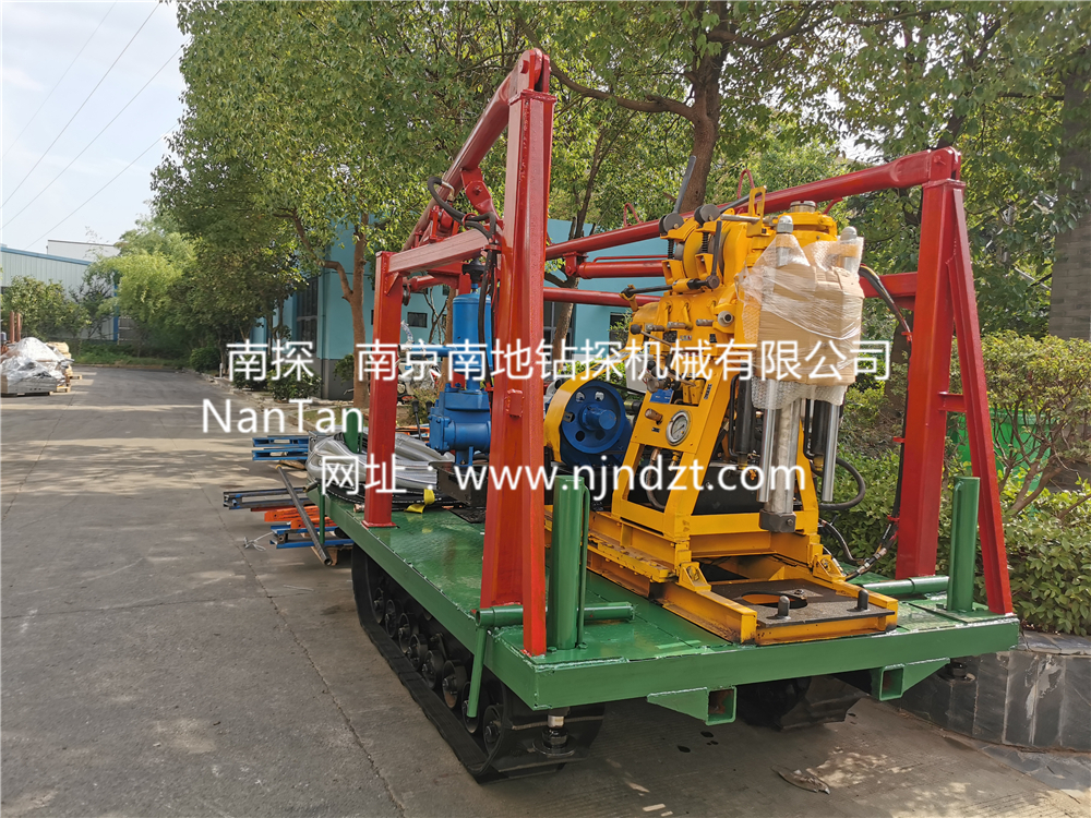 4、鉆機、泥漿泵、塔架一體,搬家方便快捷,可自行上下汽車。搬家時鉆桿鉆具等一切東西均可放在履帶底盤上一次運走。